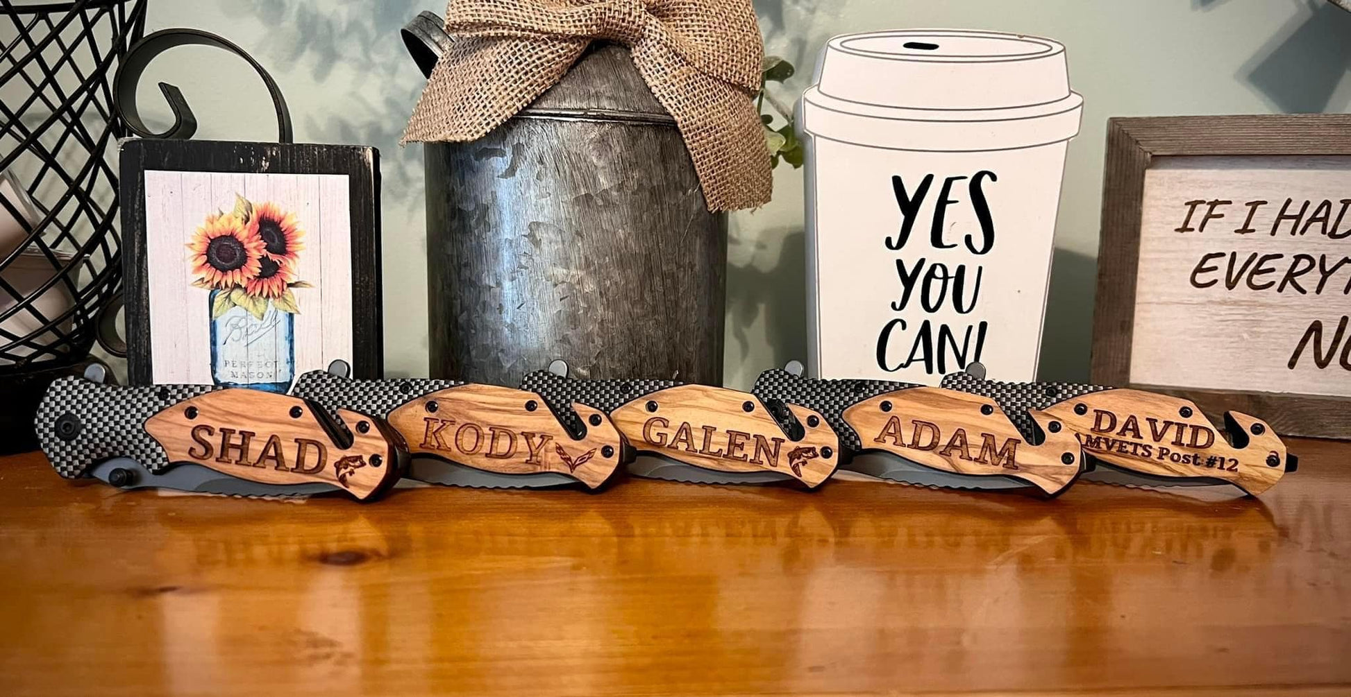 This custom engraved knife features a handle crafted from premium olive wood, known for its durability and distinctive grain patterns. Expertly balanced for optimal control, the blade delivers precise cutting performance suitable for a variety of tasks. The personalized engraving adds a refined touch, making this knife both a functional tool and a unique statement piece. These make the perfect gift for any occasion!