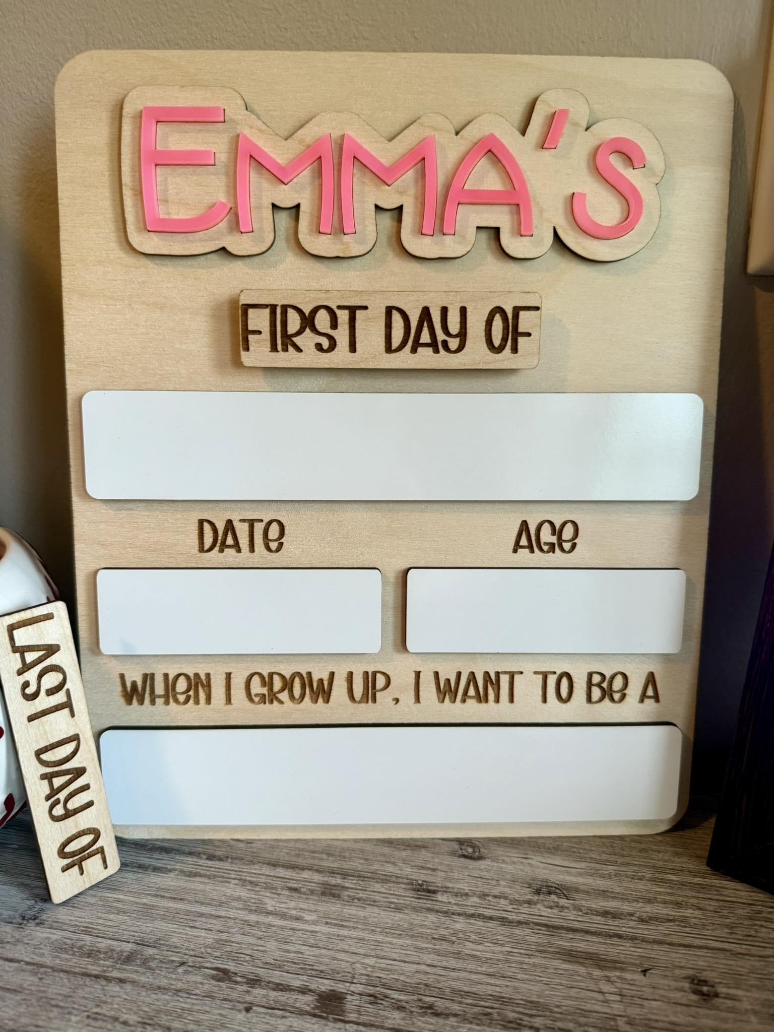This comes with up to 4 interchangeable names, and the "First Day Of" and "Last Day Of" boards are interchangeable as they are held on by magnets! Additional Names are available for purchase as well in a separate listing!