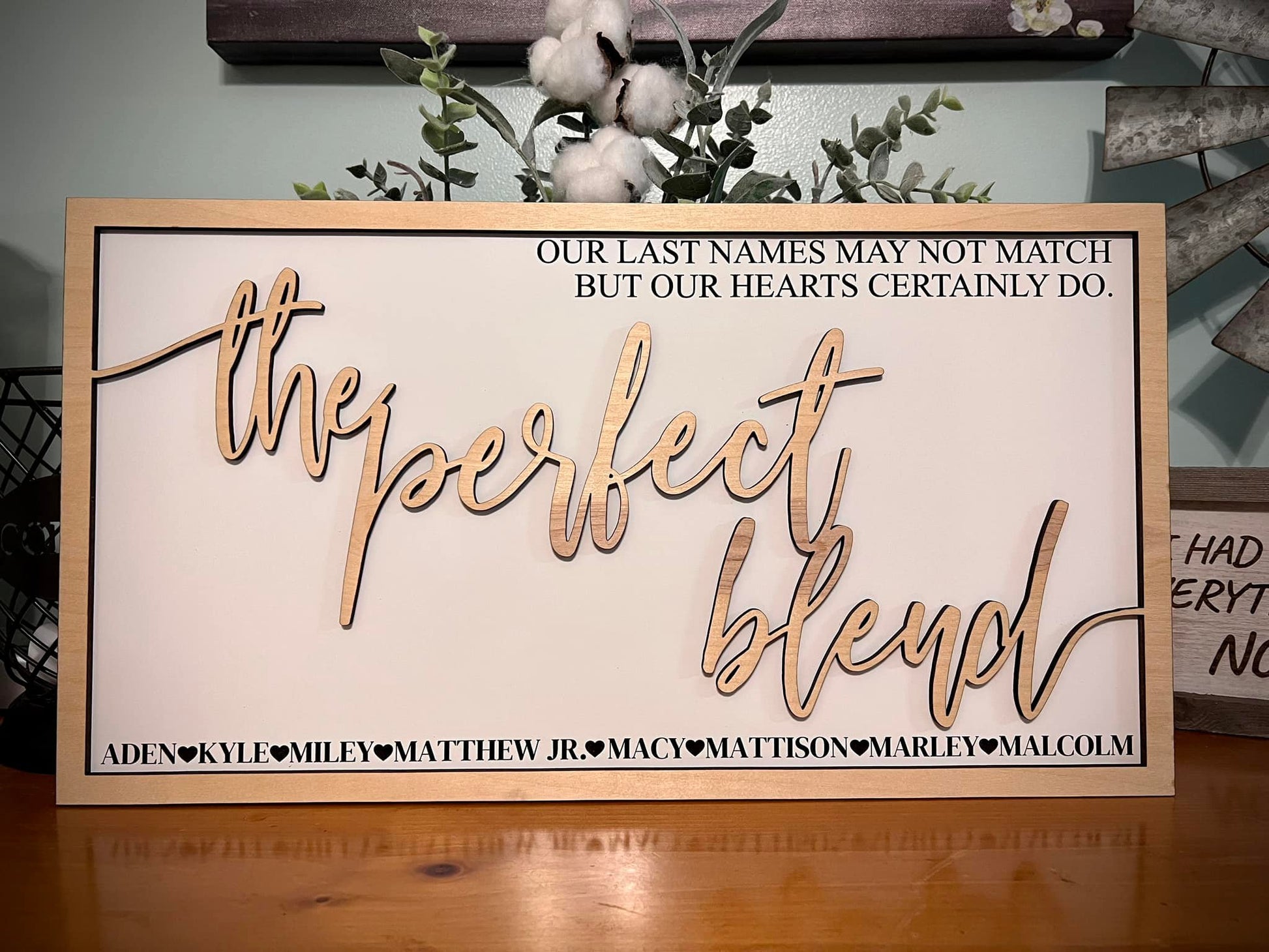 Celebrate your unique family story with "The Perfect Blend" personalized sign! This charming piece combines names or initials in a fun, creative design that highlights the beauty of your blended family. Perfect for adding a warm, playful touch to any room, it’s a delightful reminder that together, you make the perfect mix. Customize it to showcase your family’s special bond in a way that’s as joyful and unique as you are!